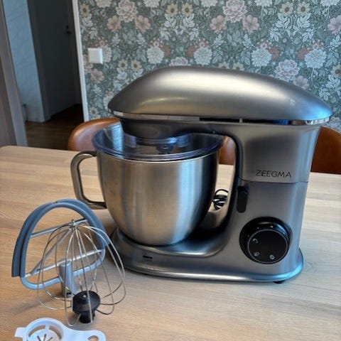 Tillbehör som medföljer är visp, degkrok och omrörare.