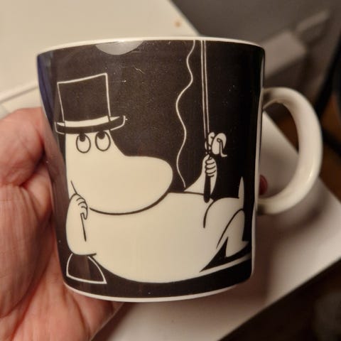 Arabia Muminburk för köksförvaring i grå, svart och vit färg.
