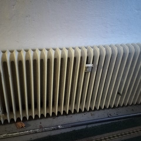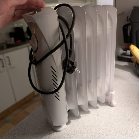 Wibax elektrisk element i vit färg. Utrustad med termostat och strömbrytare på sidan. Har två stödben för golvplacering och ansluts med sladd och kontakt.