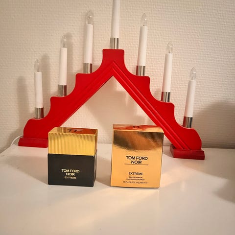 Tom Ford Noir Extreme Eau de Parfum i en svart flaska med guldfärgad kork. Parfymen har en elegant design och är avsedd för användning som doft.
