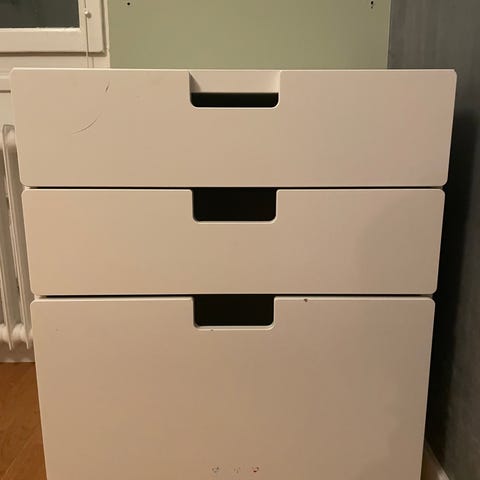 Byrån är mycket väl använd. Lådorna sitter inte fast och behöver skruvas ihop och baksidan behöver fixas till.