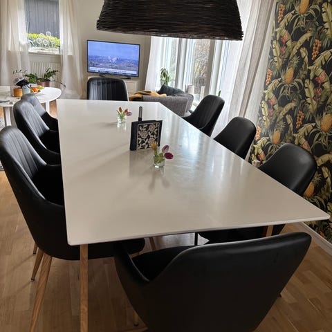 Säljer nu ett väldigt fint matbord med 6 passande skinnstolar. Bordet är av massiv trä med ekfanér-topp.