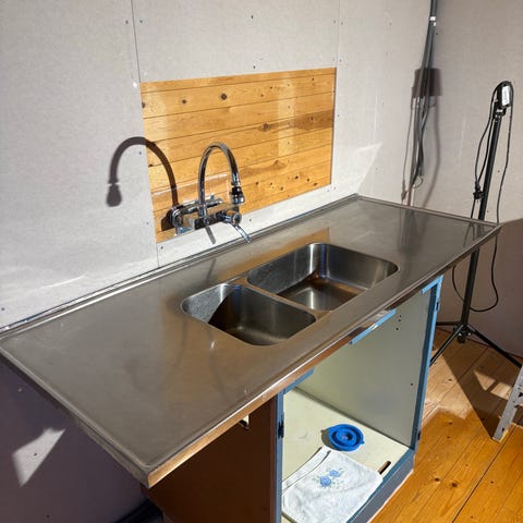 Rostfri diskbänk med mycket fin blandare och medföljande vattenlås.
