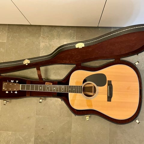 Säljer min Martin D18, tillverkad 1993. Bra skick, men väl använd och har dings och lite ytliga märken efter livrem på baksidan. Låter jättebra och är lättspelt med behaglig stränghöjd.