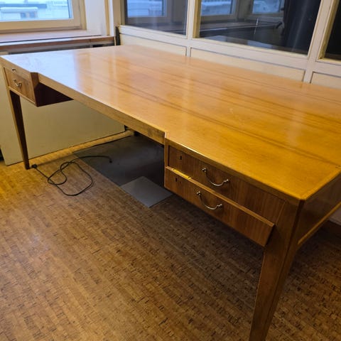 Avebe skrivbord från 50-talet. Bordet har en träskiva och metallben med justerbar höjd. Passar för arbets- eller studiemiljö.