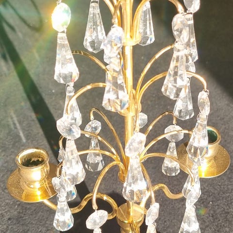 Två ljusstakar med guldfärgade metallstommar och äkta kristallprismor. Höjd 25 cm