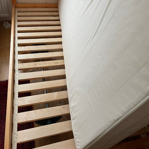 IKEA sängram med förvaringsfunktion i beige tyg. Sängramen har en träbotten med ribbotten och en stoppad sänggavel. Produkten visar tecken på användning och fläckar på tyget. Passar för standardmadrass och erbjuder extra förvaringsutrymme under sängen. Ingen ben de kan man köpa själv en fläck på sänggavel Madras till sängen finns inte