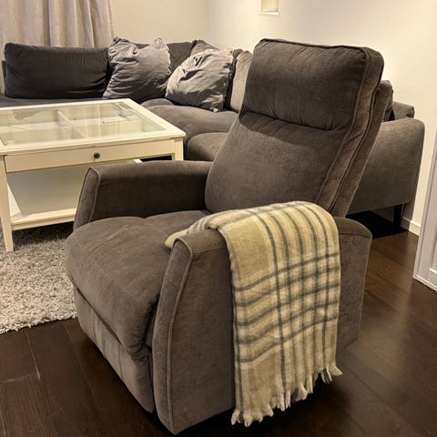 I fåtöljen kan du sitta både bekvämt upprätt och mjukt luta dig tillbaka. Sitsens glidefunktion justeras med hjälp av en lätthanterlig spak på höger sida och gör att du smidigt kan ändra position.