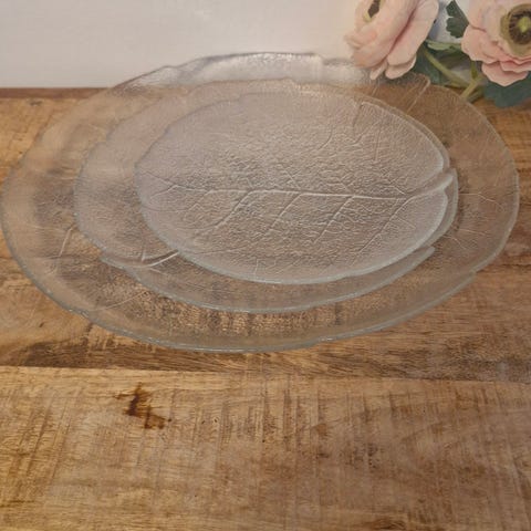 4 stycken Arcoroc France Lövet / Aspen tallrikar i glas. Mycket fint skick, inga skador. Diameter ca 23-24 cm.