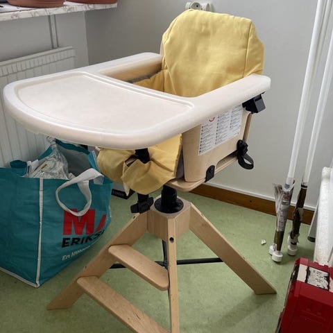 Ikeas ljusa och fina barnstol, Gråval är sparsam använd till ett barn och håller mycket längre till! Den kommer fullutrustad med bord och mjukt tillhörande ryggstöd.