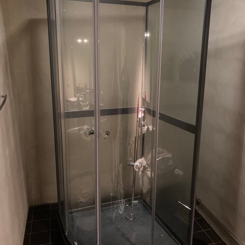 Duschkabin med tillhörande skjutdörrar och duschhandtag.