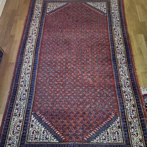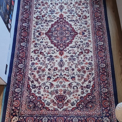 Ullmatta handknuten på bomullsvarp. Ca. 136 x 76 cm. Slitage på fransar kanter. I övrigt fräsch. Se mina övriga annonser.