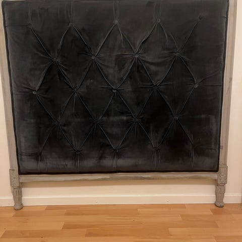 Jotex ”SKENE” sänggavel i grå sammet med knappar. Passar som huvudgavel till säng och har en mjuk och stoppad yta.