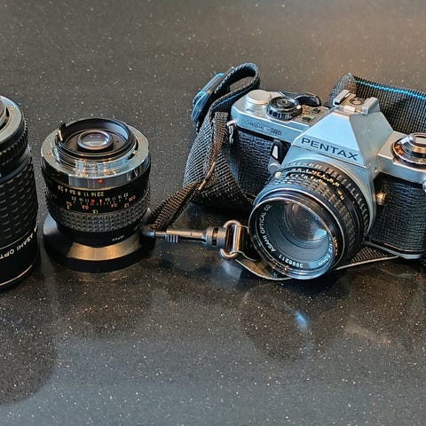 Pentax P30n systemkamera med zoomobjektiv. Kameran är svart och avsedd för fotografering med utbytbara objektiv.mkt lite använd. Bra kamera för nån som vill köra lite oldschool.