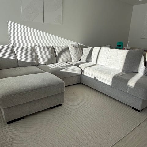 Soffa, 2 fåtöljer, fotpall i samma tyg plus Mediabänk 240 cm endast 10.600 kr