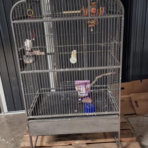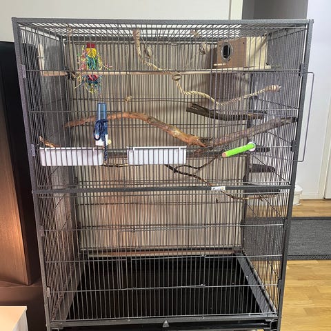 Fågelbur i svart metall med tillbehör
