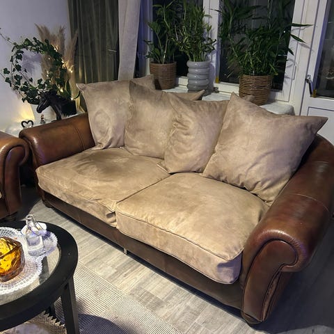 En soffgrupp av ek trä köpt i Ekeby möbler väldigt sköna bekväma och man kan byta klädsel dem var skinn vi gjorde till tyg. Samt en TV bänk i samma klass