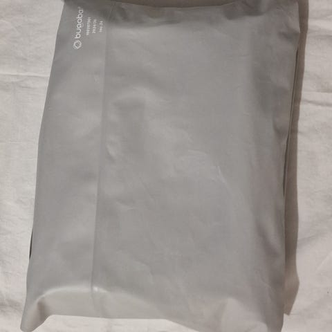 Bugaboo regnskydd till barnvagn i transparent material med svarta kanter och fästen. Designad för att skydda barnet mot regn och vind under promenader.