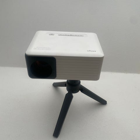Philips PicoPix Mini projektor med kompakt design. Utrustad med HDMI- och USB-portar för anslutning av olika enheter. Levereras med strömadapter och bärväska för enkel transport och skydd.