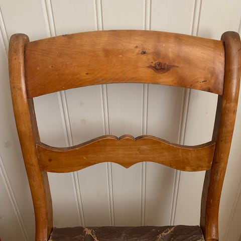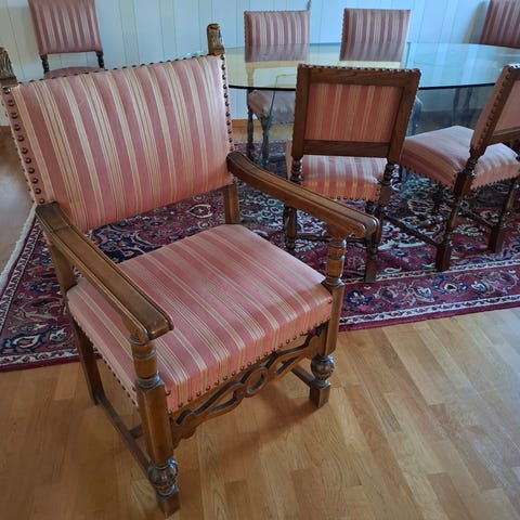 Antika stolar i ek klädda i rosa randigt moaré tyg