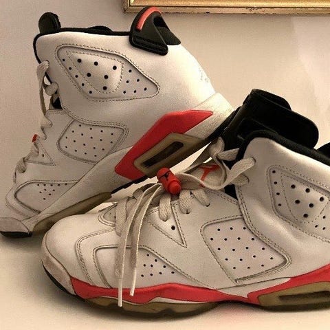Air Jordan Sneakers i storlek 44. Skorna är gråa med röda, gula och vita detaljer. De har en hög modell med snörning och är avsedda för vardagligt bruk eller sportaktiviteter.
