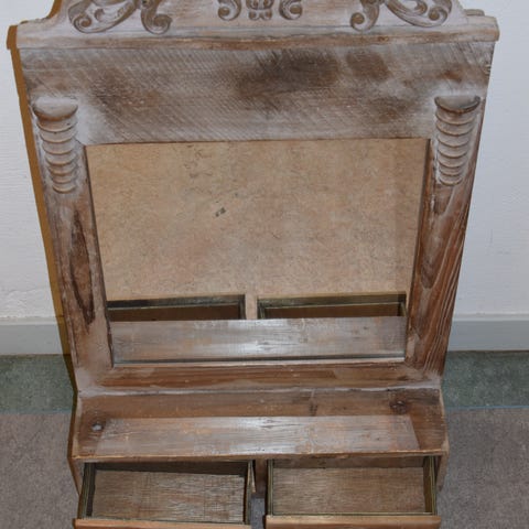 Fin väggspegel med trä och läderdetaljer