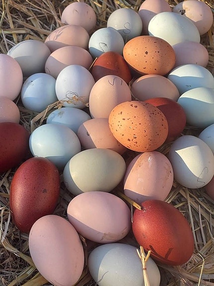 Frisk grupp med hög befruktning, där alla djur har mörk kam. Ungefär hälften av hönorna lägger ägg med bloom, vilket ger en rosa färg på äggen som annars är ljusbruna med mörkare prickar.