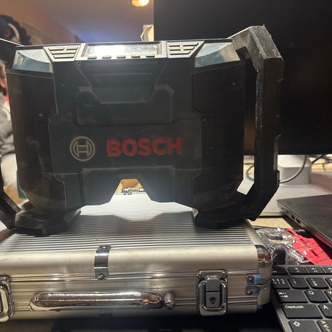Sangean byggradio i gul färg med svart skyddande ram. Utrustad med stora rattar för volym och kanalval, samt handtag för enkel transport. Designad för användning i byggmiljöer med robust konstruktion.
