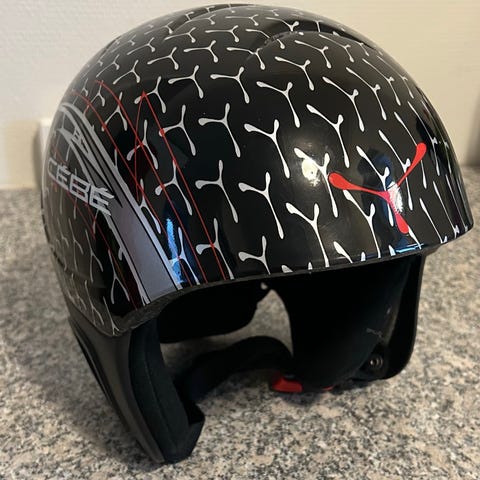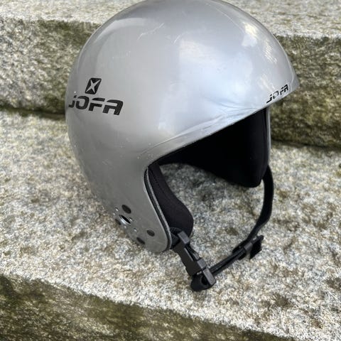 JOFA alpinhjälm i svart färg. Hjälmen har vaddering inuti och justerbar hakrem med spänne. Storlek cirka 50-54, dock något osäker på storleken.