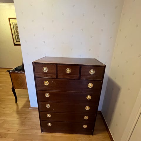 En retro vintage byrå från 60/70talet med mycket kvar att ge! Måla den eller renskrapa bort det vita för att få fram furu. Endast fanér på utsidan av stomen. Lådorna är i massiv furu. För skick se bilder.