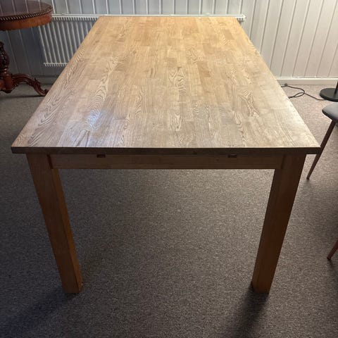 Stort härligt matbord med två iläggs skivor ’a 30 cm bordet kan bli 225 cm. Det finns en liten skada i lacken i hö hörn annars i superfint skick. Stolarna har original klädsel.