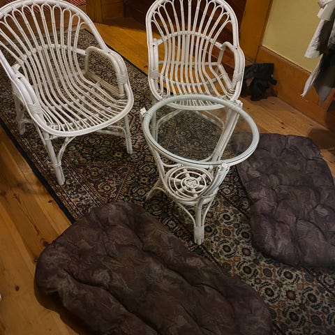 2 fåtöljer och ett bord med glasskiva säljes.