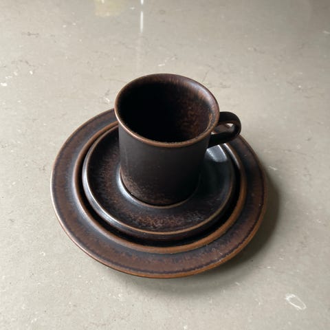 Arabia Ruska 6 låga breda koppar med fat och assietter i brunt porslin