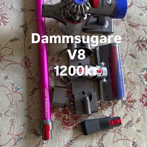 Dyson V8 Absolute Pro dammsugare med trådlös design och olika munstycken för anpassad rengöring. Enheten är rosa med blå och grå detaljer och är avsedd för hushållsbruk.