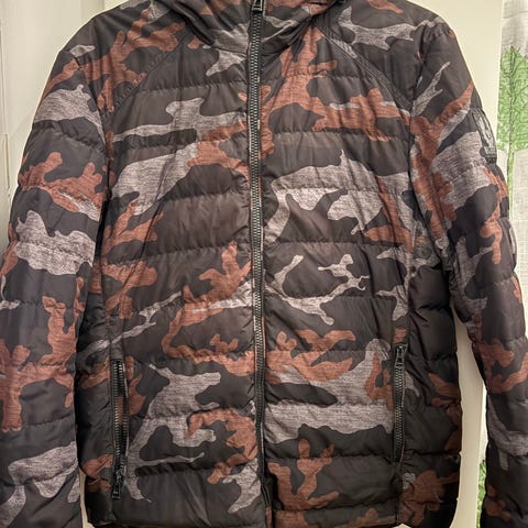 Klassisk jacka med fyra fickor framtill och en hög krage. Jackan har en mörk färg och stängs med knappar. På vänster ärm finns en logotyp.