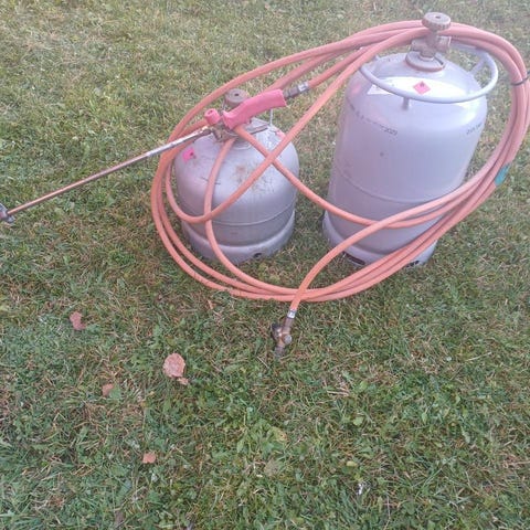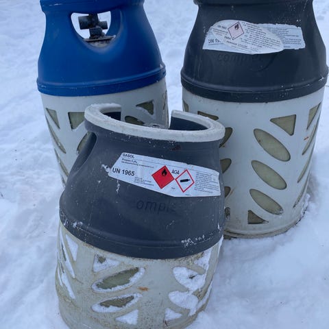 Två gasolflaskor med skyddande hölje i färgerna blå och grå. Flaskorna är utrustade med ventil och handtag för hantering. Används för förvaring och transport av gasol. En 5 liter och en 10 liter. Båda flaskorna är tomma.