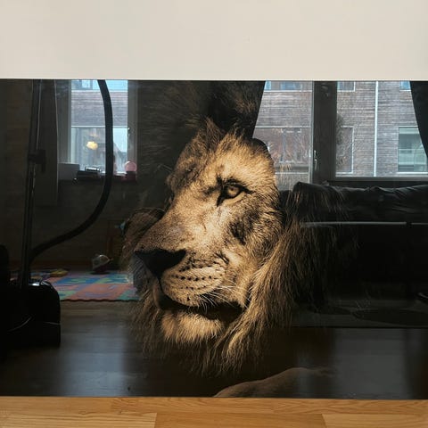 Tavlan är 120x180cm stor. Soffan på bilderna är 260cm. Plexiglaset är 5 mm tjock.