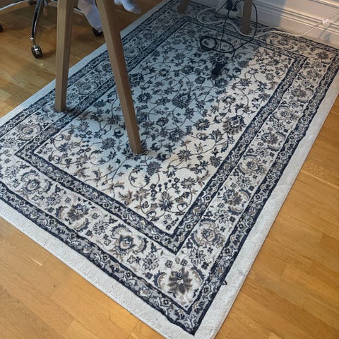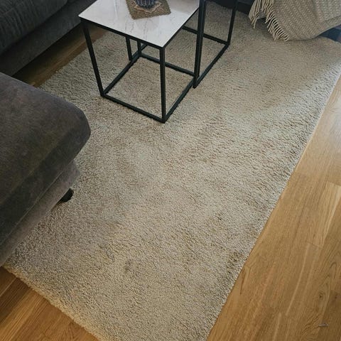 Säljer en ljus matta i neutral färg, passar bra i vardagsrum eller sovrum. Normal användning. Det finns ett mörkare gångstråk/slitage i mitten av mattan (se bild), vilket är vanligt vid användning och påverkar inte funktionen.