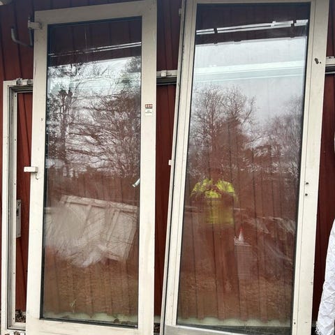 Glasparti med dekorativa mönster i glas och metall. Passar för användning som insynsskydd eller som en dekorativ detalj i dörrar eller fönster.