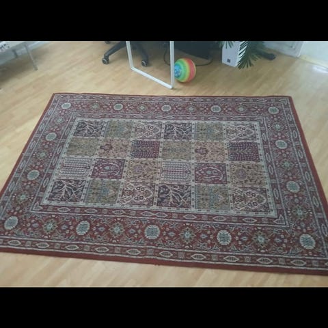 Stor röd matta önskar få ett nytt hem.