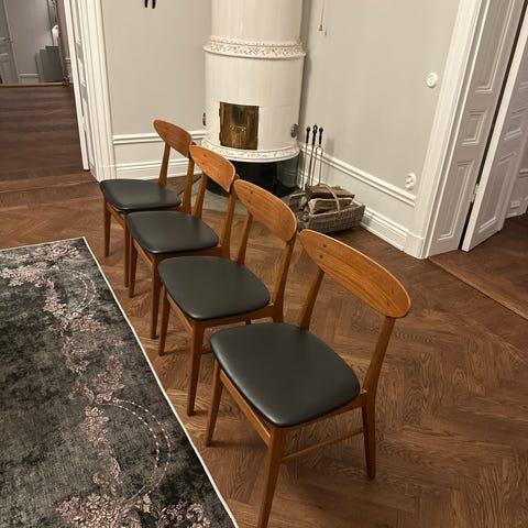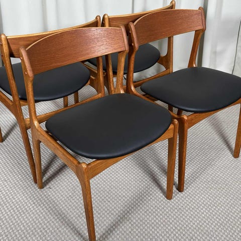 Stolarna är i teak med nyslipad och oljad yta samt nyklädda sitsar i neutral, tidlös ton.