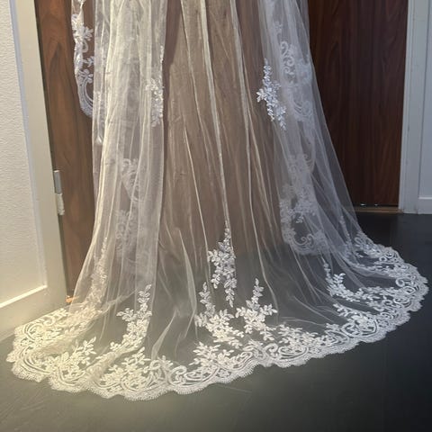 2 st brudslöjor i tyll, besmyckade med pärlor. Fästest med kam som syns på sista bilden. En vit och en benvit slöja. Slöjan på bilderna med klänning är benvit och bilderna på enbart slöja är den vita.