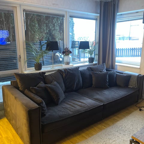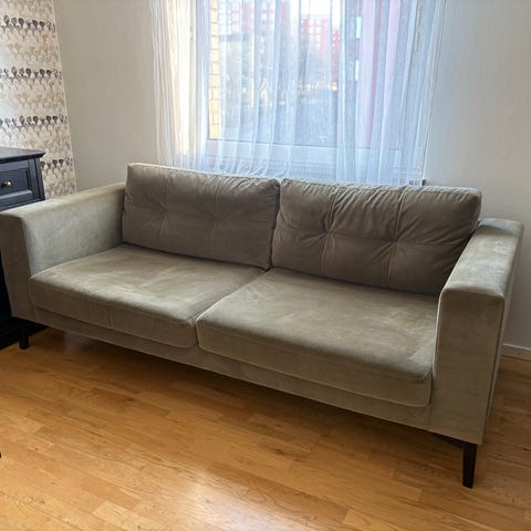 3-sits soffa i grå sammet inköpt på Mantorp möbler.