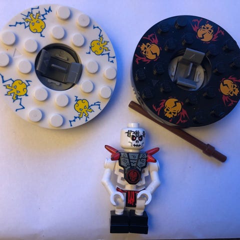 LEGO NINJAGO minifigurer, Ninja Jay. Det saknas en huvudbonad på ena figuren och huvudet är nog inte till den figuren. Svärdet till den ena gubben ska nog vara svart.