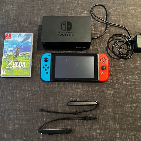 Nintendo Switch Joy-Con handkontroller i röd och blå färg. Tillbehör för Nintendo Switch-konsol. Handkontrollerna har handledsremmar för säker användning.