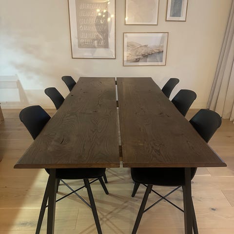 Matrums bord vitt stort 199x106 med en iläggs skiva finns i men finns en till skiva om man vill ha större 6 stolar + två karmstolar. Obs bordet finns i Ängelholm