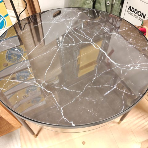 Soffbord i massiv ek, brunbetsat. 4 nedsänkta glasskivor totalt 6 lådor 3 st på motstående sidor.