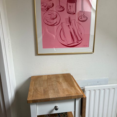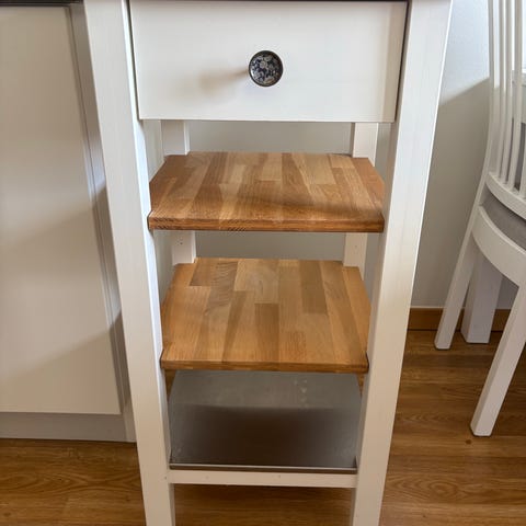Köksö med träskiva och vitmålad stomme. Har två öppna hyllplan för förvaring. Passar för kök eller matplats som extra arbetsyta eller förvaring.