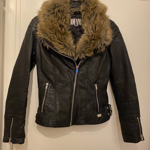 Tidlös och stilren skinnjacka från svenska Jofama (Malung). Modellen är kort och rundhalsad (utan krage) vilket ger en elegant och feminin look. Passar lika bra som en tuffare blazer på kontoret som till festklänningen eller jeansen.