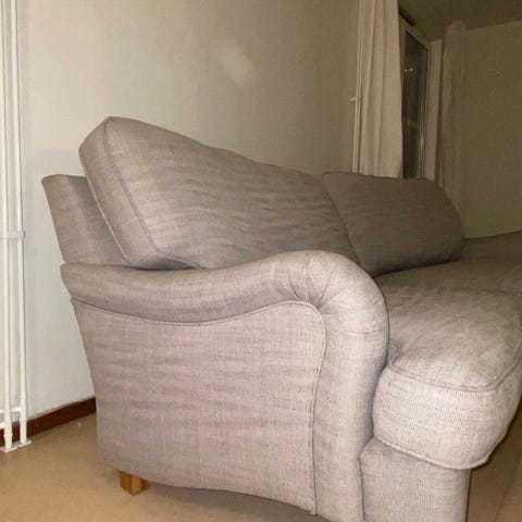 Fin Howardsoffa från Mio i greige tyg stoppad med dun/fjäder Ta med bärhjälp.